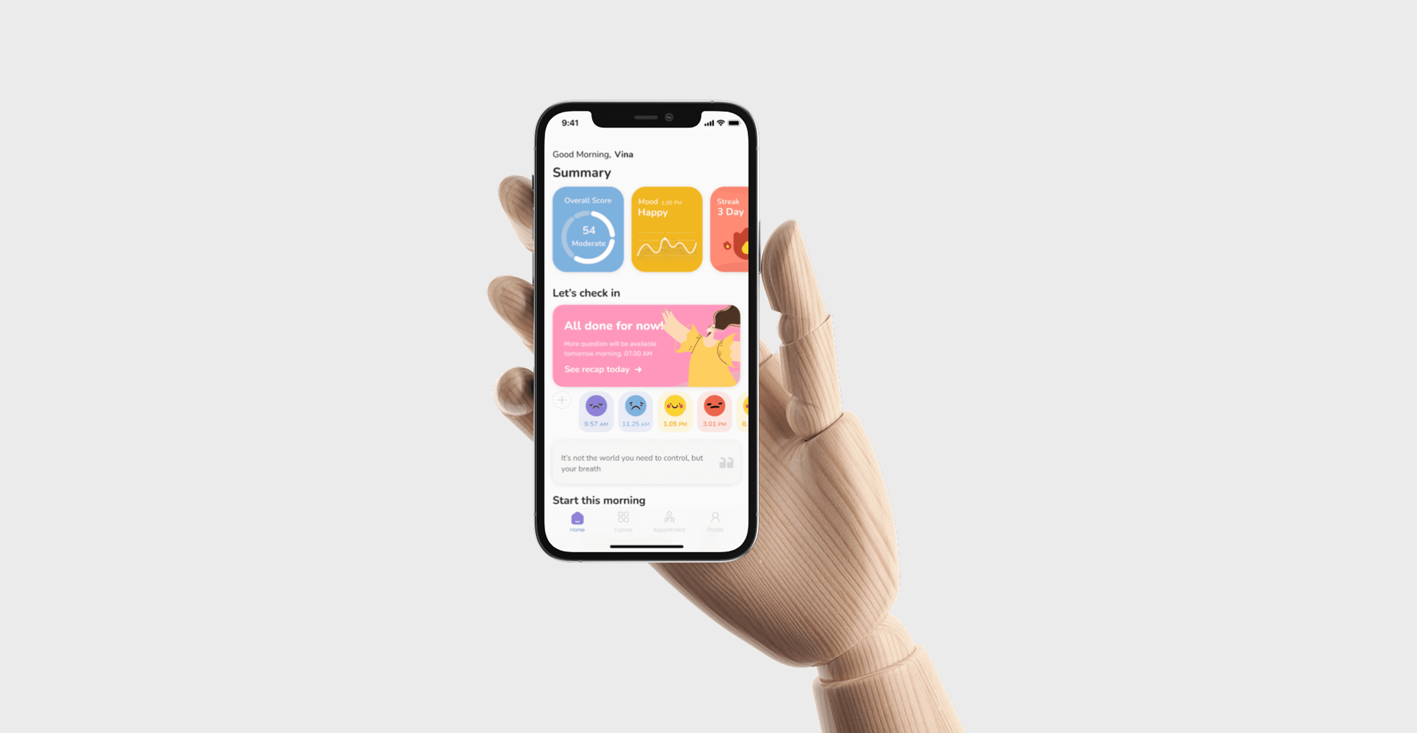 Helps users manage stress, build self-care habits, and understand their emotions, while creating a safe, comforting space where they feel accompanied every day.